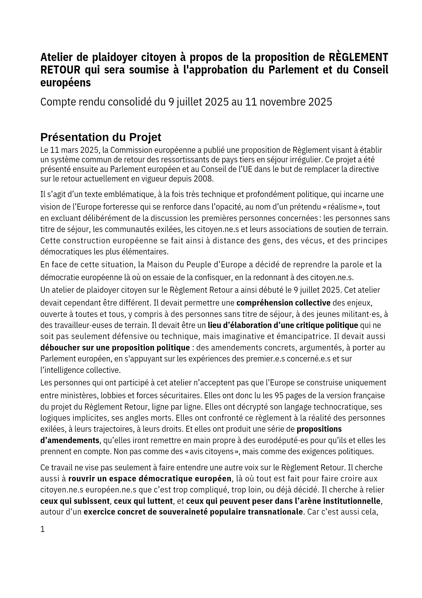 Elle implique tous les citoyens européens et résidents en Europe dans la construction d’une Europe des citoyens. Cela est possible en permettant à la société civile de s’informer, de se former et de s’impliquer dans les débats régionaux, nationaux et européens jusqu’à l’élaboration de propositions d’amendements, voire de propositions de projets législatifs.
